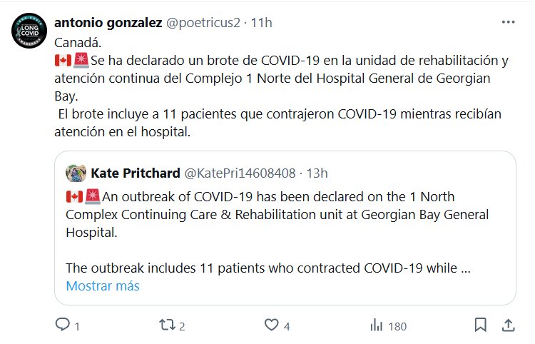 SISTEMA DE SALUD INSALUBRE Canadá. 🇨🇦🚨Se ha declarado un brote de COVID-19 en la unidad de rehabilitación y atención continua del Complejo 1 Norte del Hospital General de Georgian Bay. El brote incluye a 11 pacientes que contrajeron COVID-19 mientras recibían atención en el hospital.