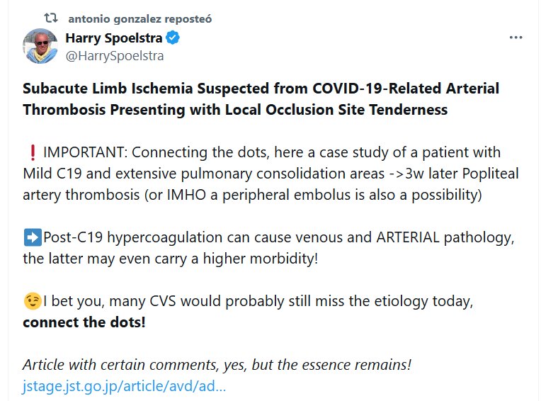 EN INGLÉS La hipercoagulación post-C19 puede causar patología venosa y ARTERIAL, ¡esta última puede incluso conllevar una mayor morbilidad! Posted on abril 12, 2024 por coronado https://www.jstage.jst.go.jp/article/avd/advpub/0/advpub_cr.23-00115/_pdf/-char/en