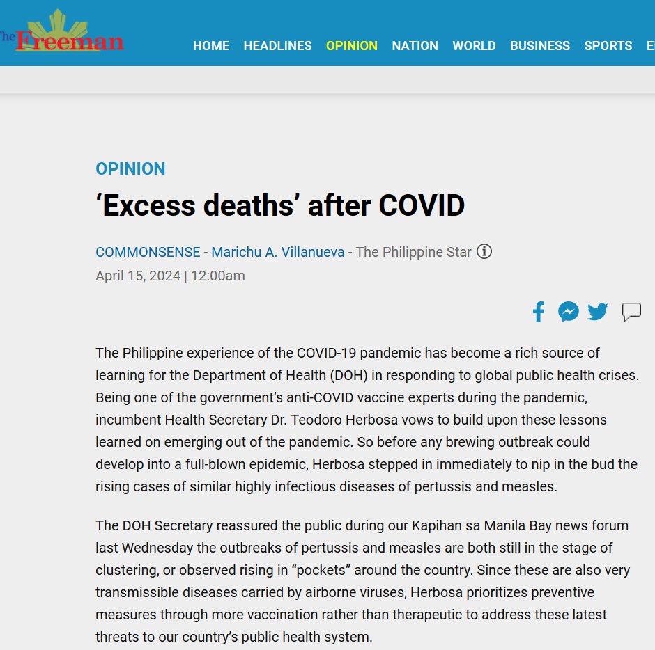 FILIPINAS (EN INGLÉS) ‘Exceso de muertes’ después del COVID Posted on abril 14, 2024 por coronado https://www.philstar.com/the-freeman/opinion/2024/04/15/2347698/excess-deaths-after-covid