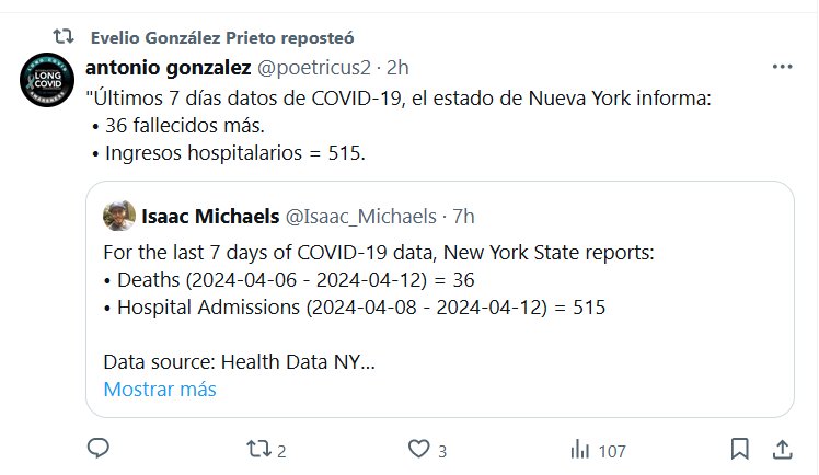 YA NO HAY… FUERA DEL HOSPITAL O DEL CEMENTERIO! «Últimos 7 días datos de COVID-19, el estado de Nueva York informa: • 36 fallecidos más. • Ingresos hospitalarios = 515 Posted on abril 14, 2024 por coronado