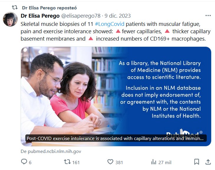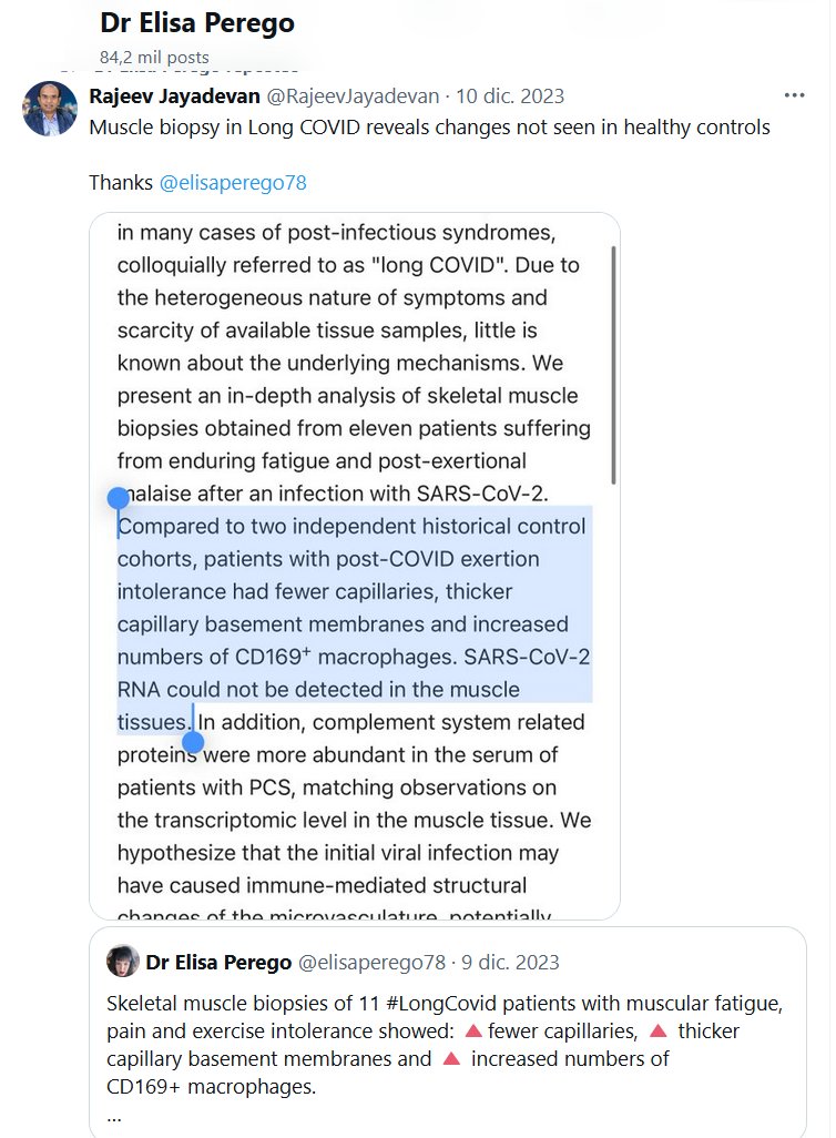 Dra. Elisa Perego @elisaperego78 (EN INGLÉS) Las biopsias del músculo esquelético de 11 pacientes de #LongCovid con fatiga muscular, dolor e intolerancia al ejercicio mostraron: 🔺menos capilares, 🔺membranas basales capilares más gruesas y 🔺un mayor número de macrófagos CD169+