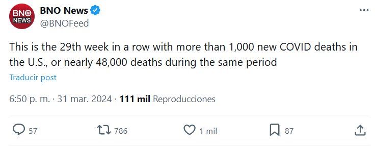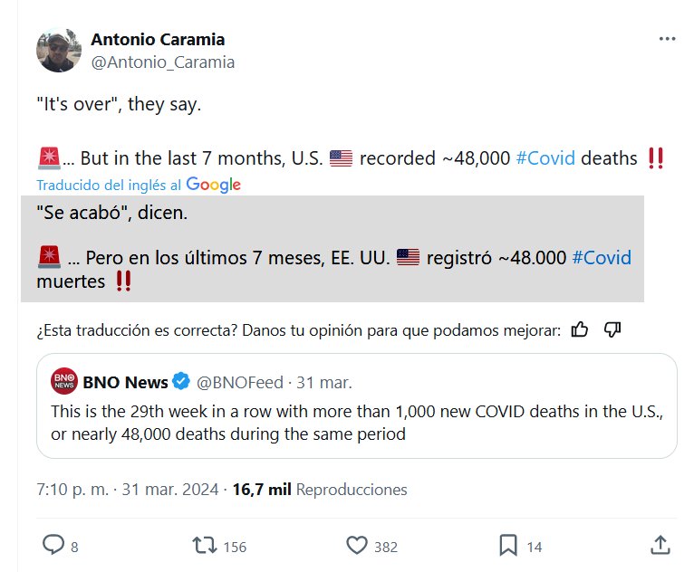 EN INGLÉS «Se acabó», dicen. 🚨 … Pero en los últimos 7 meses, EE. UU. 🇺🇸 registró ~48.000 #Covid muertes ‼️ Posted on abril 15, 2024 por coronado https://twitter.com/BNOFeed/status/1774554764828901622