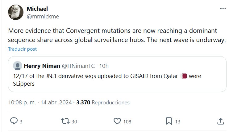 DERIVADA DE JN.1 ‘Más evidencia de que las mutaciones convergentes están alcanzando una secuencia dominante en los centros de vigilancia globales. La próxima ola está en marcha» Posted on abril 15, 2024 por coronado