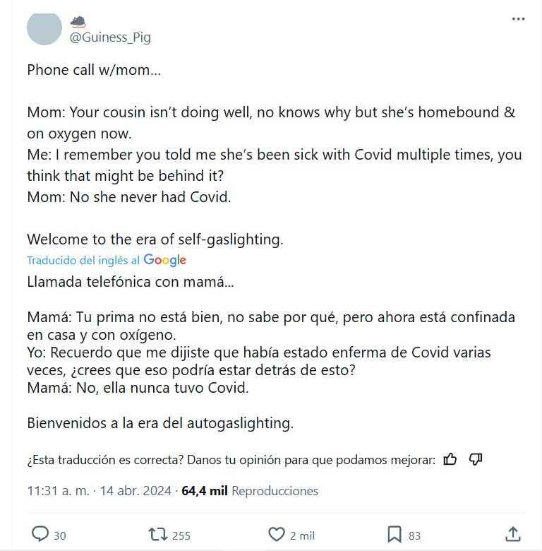TÉCNICAS PARA LA CONFABULACIÓN COVID «Llamada telefónica con mamá… Mamá: Tu prima no está bien, no sabe por qué, pero ahora está confinada en casa y con oxígeno. Yo: Recuerdo que me dijiste que había estado enferma de Covid varias veces, ¿crees que eso podría estar detrás de esto? Mamá: No, ella nunca tuvo Covid» Bienvenidos a la era del autogaslighting (MANIPULACIÓN MENTAL)