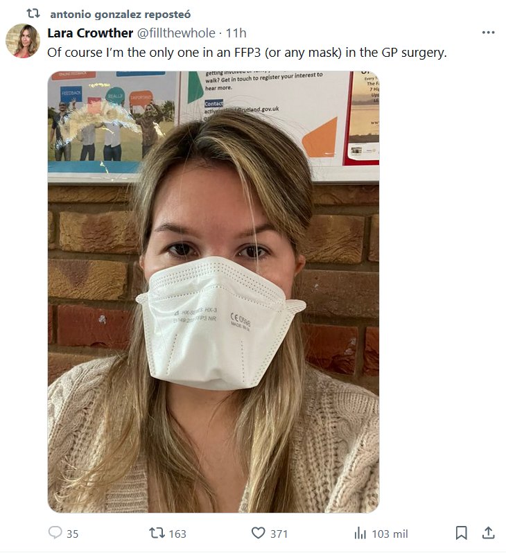Y ERES LA ÚNICA QUE APARECE AQUÍ (EN INGLÉS) Lara Crowther @llenareltodo · Por supuesto, soy la única que lleva una FFP3 (o cualquier mascarilla) en la consulta del médico de cabecera Posted on abril 15, 2024 por coronado
