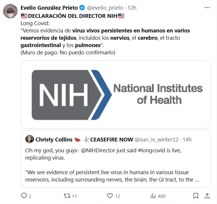 🇺🇸DECLARACIÓN DEL DIRECTOR NIH🇺🇸 Long Covid: «Vemos evidencia de virus vivos persistentes en humanos en varios reservorios de tejidos, incluidos los nervios, el cerebro, el tracto gastrointestinal y los pulmones».