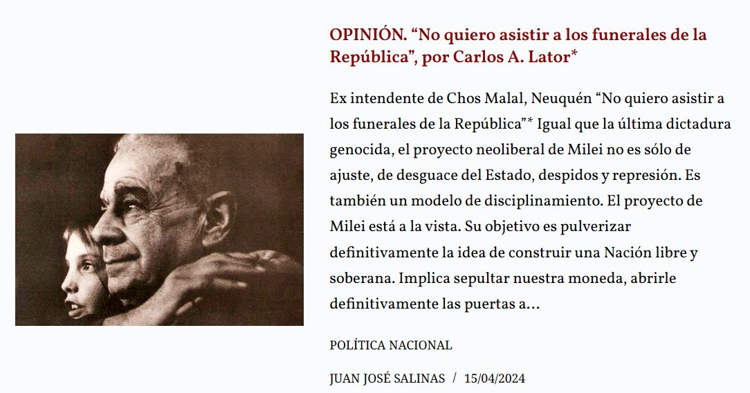 ES VIRAL Carlos A. Lator: Ex intendente de Chos Malal, Neuquén “No quiero asistir a los funerales de la República” Posted on abril 16, 2024 por coronado https://pajarorojo.com.ar/opinion-no-quiero-asistir-a-los-funerales-de-la-republica-por-carlos-a-lator/