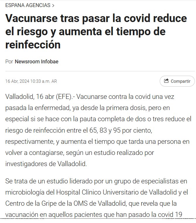 Vacunarse tras pasar la covid reduce el riesgo y aumenta el tiempo de reinfección ¿O EL TIEMPO HASTA UNA REINFECCIÓN? Posted on abril 16, 2024 por coronado https://www.infobae.com/espana/agencias/2024/04/16/vacunarse-tras-pasar-la-covid-reduce-el-riesgo-y-aumenta-el-tiempo-de-reinfeccion/