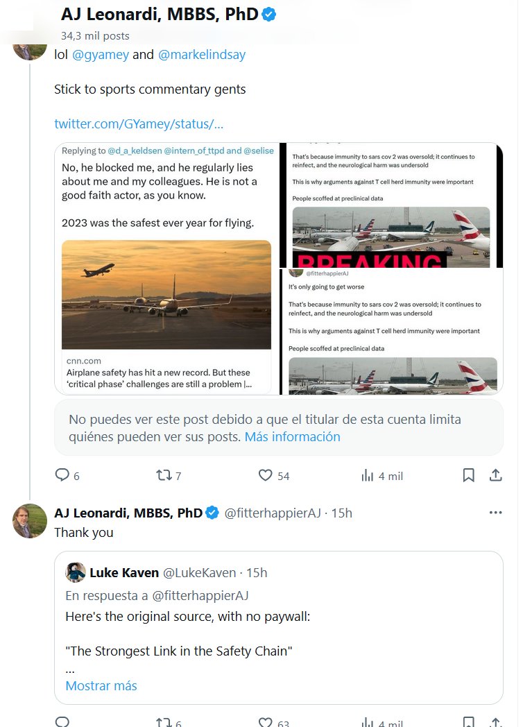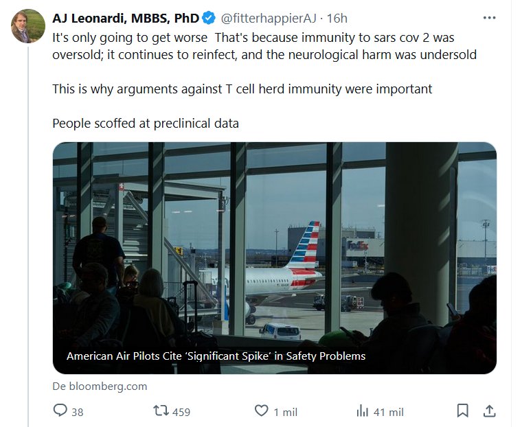 LA LUCHA EN SOLITARIO DE NUESTROS HÉROES (EN INGLÉS) AJ Leonardi, MBBS, doctorado @fitterhappierAJ · Solo va a empeorar. Eso se debe a que se sobrevendió la inmunidad al sars cov 2; continúa reinfectándose y el daño neurológico fue subestimado Por eso eran importantes los argumentos contra la inmunidad colectiva de las células T La gente se burló de los datos preclínicos