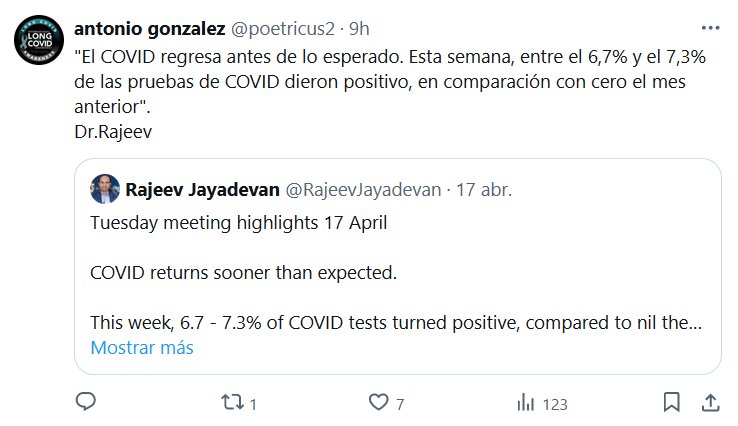 NUNCA SE FUE PERO YA REGRESA! «El COVID regresa antes de lo esperado. Esta semana, entre el 6,7% y el 7,3% de las pruebas de COVID dieron positivo, en comparación con cero el mes anterior». Dr.Rajeev