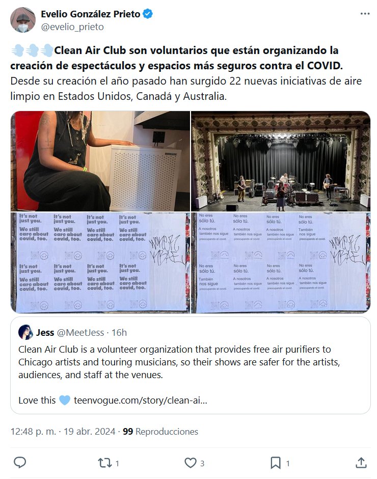 💨💨💨Clean Air Club son voluntarios que están organizando la creación de espectáculos y espacios más seguros contra el COVID. Desde su creación el año pasado han surgido 22 nuevas iniciativas de aire limpio en Estados Unidos, Canadá y Australia.