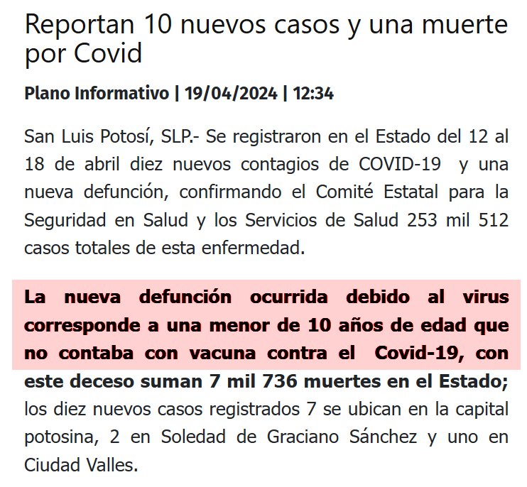 MÉXICO San Luis Potosí La nueva defunción ocurrida debido al virus corresponde a una menor de 10 años de edad que no contaba con vacuna contra el Covid-19, con este deceso suman 7 mil 736 muertes en el Estado