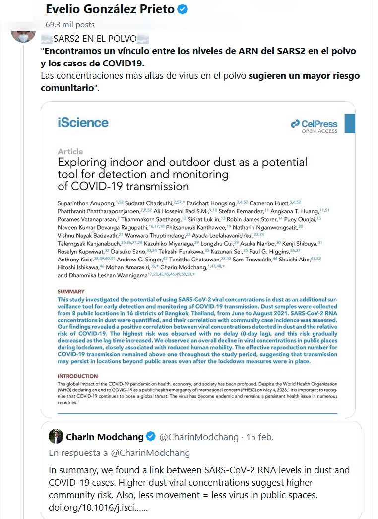 🌫️SARS2 EN EL POLVO🌫️ «Encontramos un vínculo entre los niveles de ARN del SARS2 en el polvo y los casos de COVID19. Las concentraciones más altas de virus en el polvo sugieren un mayor riesgo comunitario».