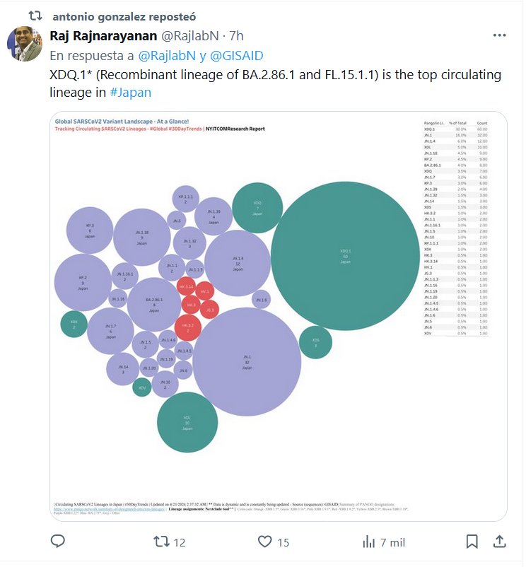 EN INGLÉS : XDQ.1* (linaje recombinante de BA.2.86.1 y FL.15.1.1) es el linaje de mayor circulación en #Japón Posted on abril 21, 2024 por coronado