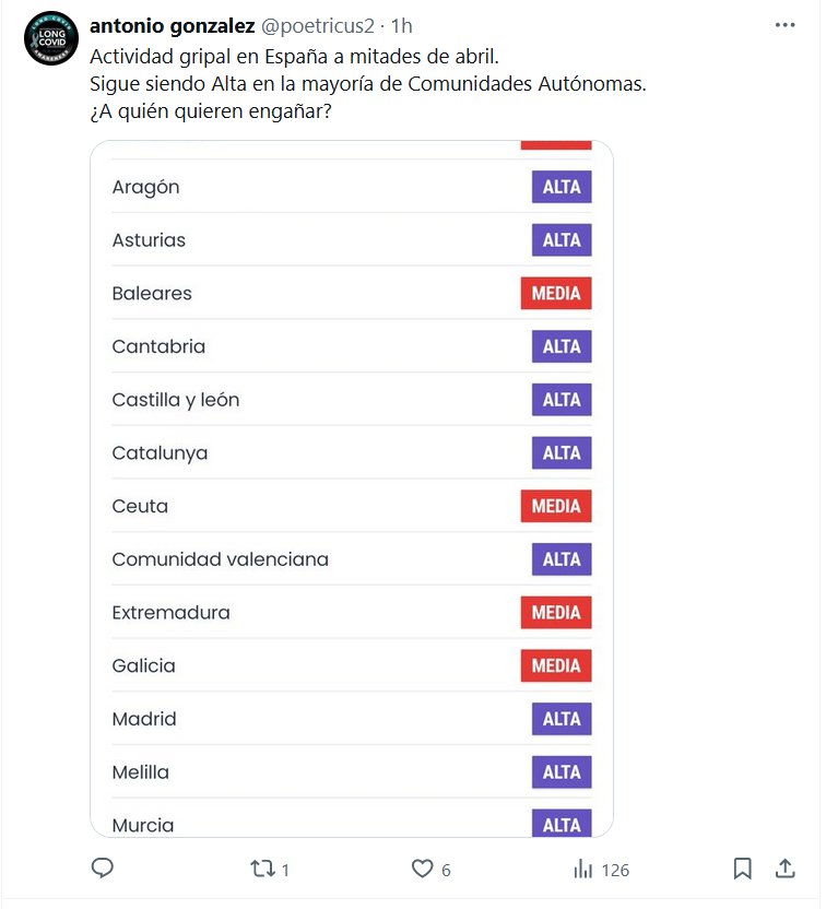COVID GRIPALIZADO EN ESPAÑA Actividad gripal en España a mitades de abril. Sigue siendo Alta en la mayoría de Comunidades Autónomas. ¿A quién quieren engañar? Posted on abril 22, 2024 por coronado