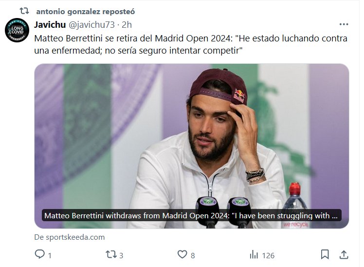 ENFERMEDADES MISTERIOSAS EN ERA COVID Matteo Berrettini se retira del Madrid Open 2024: «He estado luchando contra una enfermedad; no sería seguro intentar competir» Posted on abril 22, 2024 por coronado