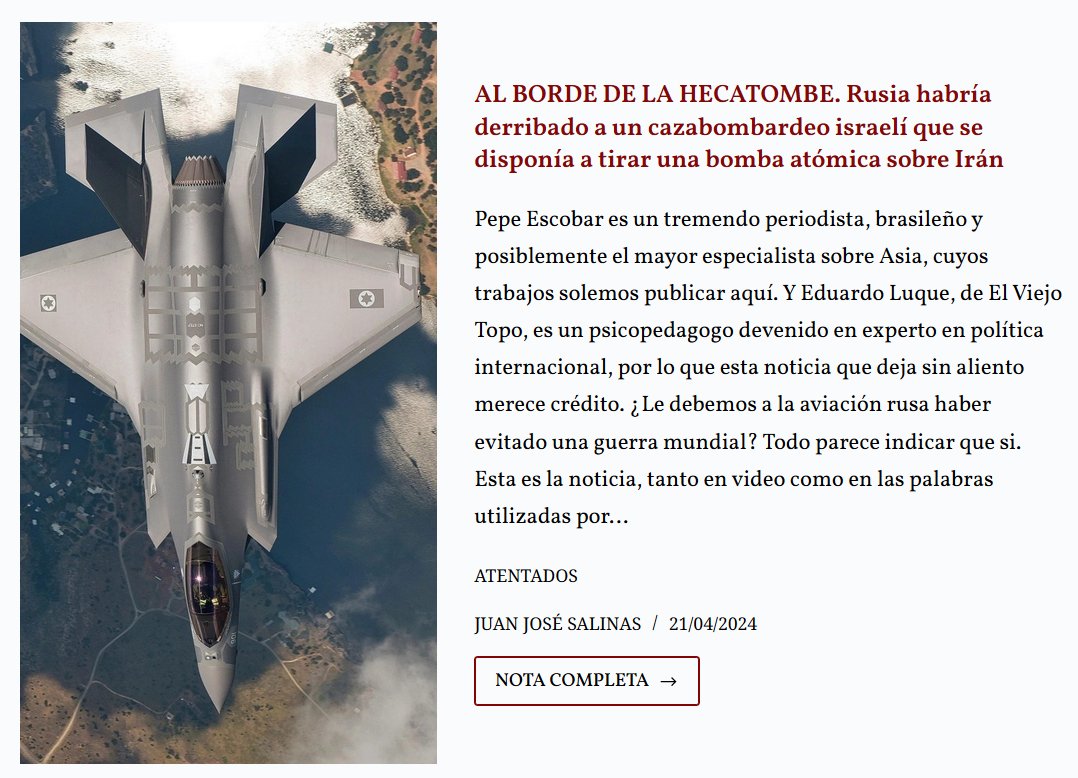 PESTE III GUERRA: AL BORDE DE LA HECATOMBE. Rusia habría derribado a un cazabombardeo israelí que se disponía a tirar una bomba atómica sobre Irán Posted on abril 22, 2024 por coronado https://pajarorojo.com.ar/al-borde-de-la-hecatombe-rusia-habria-derribado-a-un-cazabombardeo-israeli-que-se-disponia-a-tirar-una-bomba-atomica-sobre-iran/