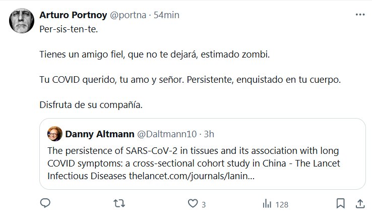 TE BURLABAS DE LOS CUIDADOS? «Per-sis-ten-te. Tienes un amigo fiel, que no te dejará, estimado zombi. Tu COVID querido, tu amo y señor. Persistente, enquistado en tu cuerpo. Disfruta de su compañía.»