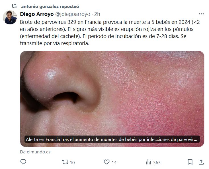 EXTRAÑAS ENFERMEDADES EN LA ERA COVID Brote de parvovirus B29 en Francia provoca la muerte a 5 bebés en 2024 (<2 en años anteriores). El signo más visible es erupción rojiza en los pómulos (enfermedad del cachete). El período de incubación es de 7-28 días. Se transmite por vía respiratoria.