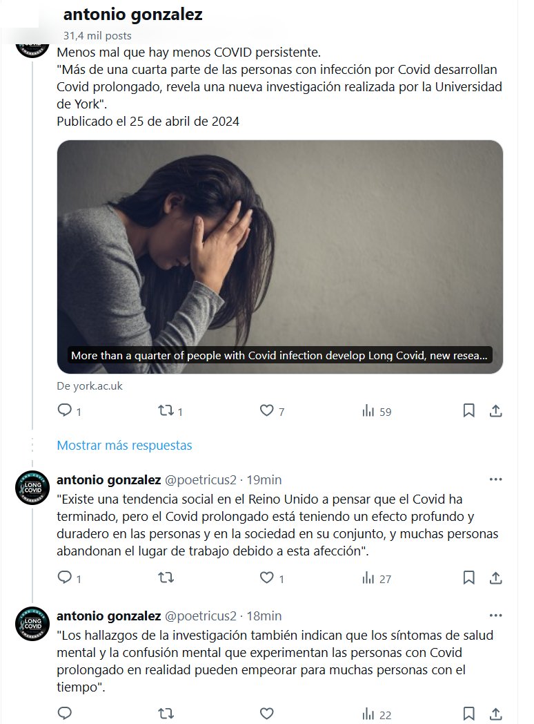 Menos mal que hay menos COVID persistente. «Más de una cuarta parte de las personas con infección por Covid desarrollan Covid prolongado, revela una nueva investigación realizada por la Universidad de York». Publicado el 25 de abril de 2024