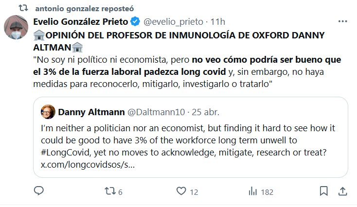 🏦OPINIÓN DEL PROFESOR DE INMUNOLOGÍA DE OXFORD DANNY ALTMAN🏦 «No soy ni político ni economista, pero no veo cómo podría ser bueno que el 3% de la fuerza laboral padezca long covid y, sin embargo, no haya medidas para reconocerlo, mitigarlo, investigarlo o tratarlo»