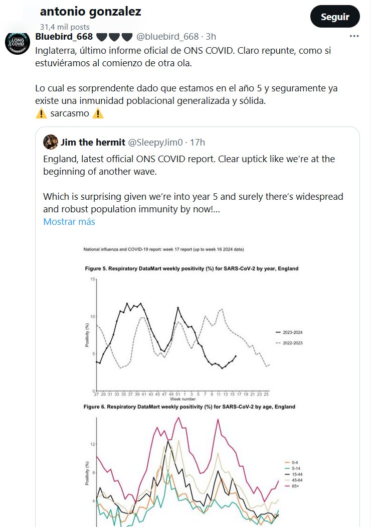 Inglaterra, último informe oficial de ONS COVID. Claro repunte, como si estuviéramos al comienzo de otra ola. Lo cual es sorprendente dado que estamos en el año 5 y seguramente ya existe una inmunidad poblacional generalizada y sólida. ⚠️ sarcasmo ⚠️