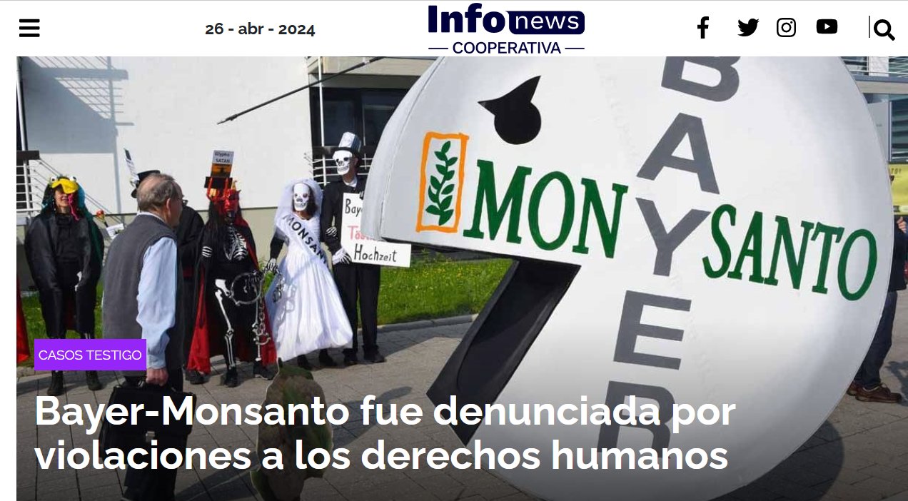 PESTE GLIFOSATO: CASOS TESTIGO Bayer-Monsanto fue denunciada por violaciones a los derechos humanos Posted on abril 26, 2024 por coronado https://infonews.com/bayer-monsanto-fue-denunciada-por-violaciones-a-los-derechos-humanos.html
