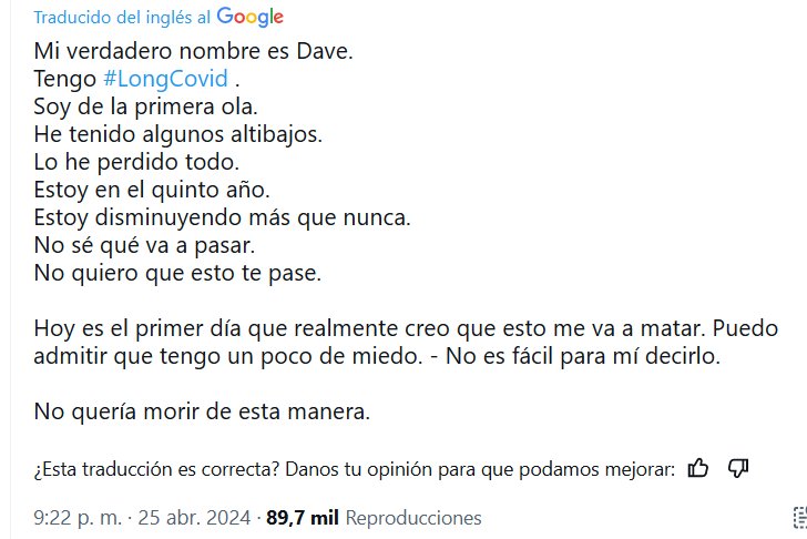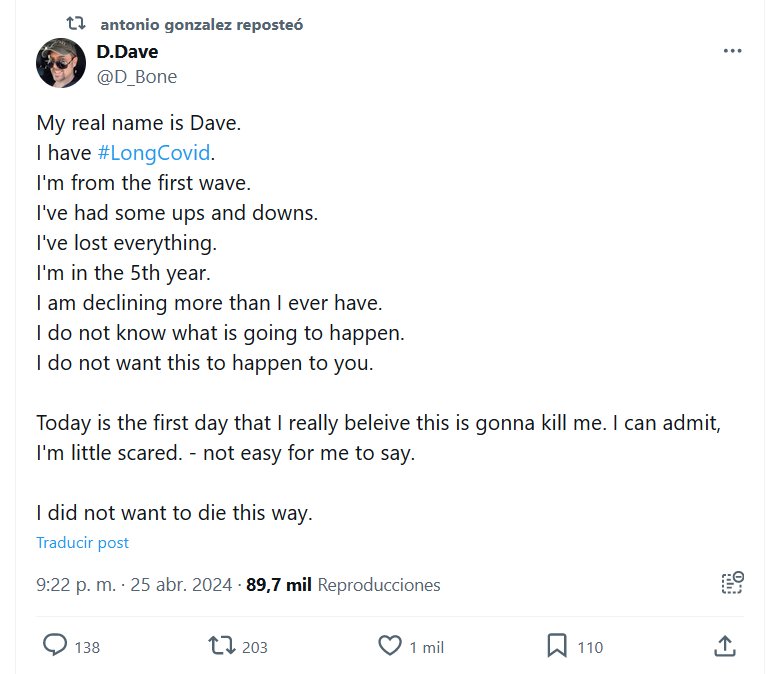 TESTIMONIOS (EN INGLÉS) D. Dave @D_Bone · Mi verdadero nombre es Dave. Tengo #CovidLargo. Soy de la primera ola. He tenido algunos altibajos. Lo he perdido todo. Estoy en el quinto año… Hoy es el primer día que realmente creo que esto me va a matar. Puedo admitir que tengo un poco de miedo. – No es fácil para mí decirlo. No quería morir de esta manera.