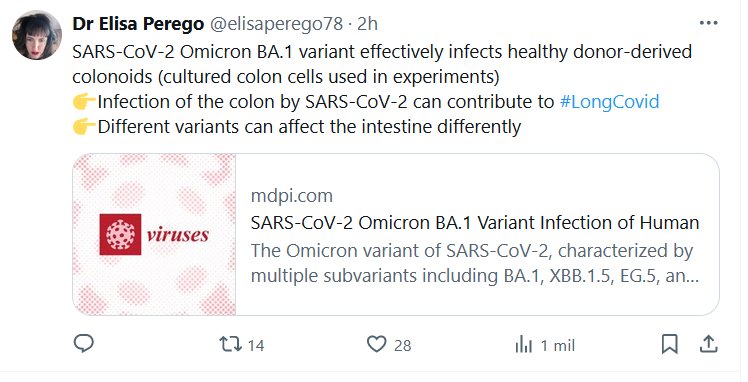 Dra. Elisa Perego @elisaperego78 · La variante Omicron BA.1 del SARS-CoV-2 infecta eficazmente colonoides sanos derivados de donantes (células de colon cultivadas utilizadas en experimentos) 👉La infección del colon por SARS-CoV-2 puede contribuir al #LongCovid 👉Diferentes variantes pueden afectar el intestino de manera diferente