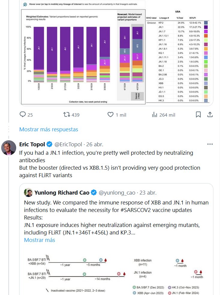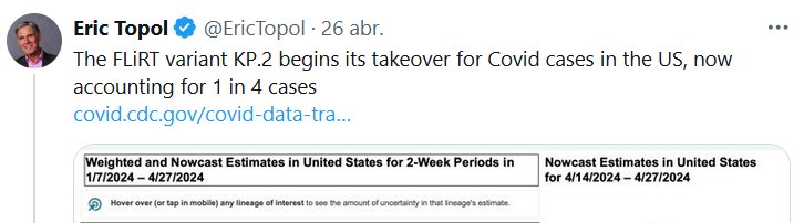 EN INGLÉS La variante FLiRT KP.2 comienza a tomar control de los casos de Covid en EE. UU. y ahora representa 1 de cada 4 casos Posted on abril 28, 2024 por coronado https://covid.cdc.gov/covid-data-tracker/#variant-proportions
