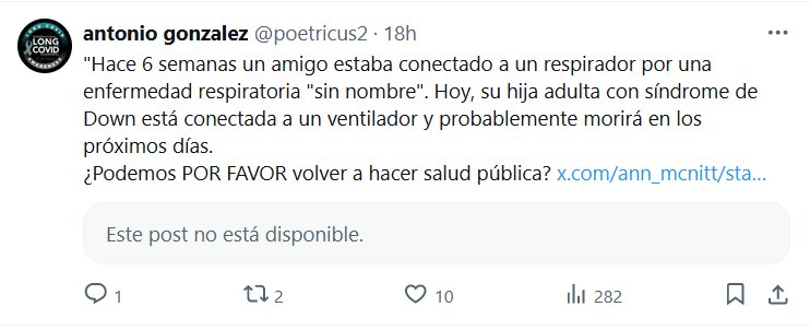 NODIGASCOVID HACE ESTRAGOS «Hace 6 semanas un amigo estaba conectado a un respirador por una enfermedad respiratoria «sin nombre». Hoy, su hija adulta con síndrome de Down está conectada a un ventilador y probablemente morirá en los próximos días. ¿Podemos POR FAVOR volver a hacer salud pública?