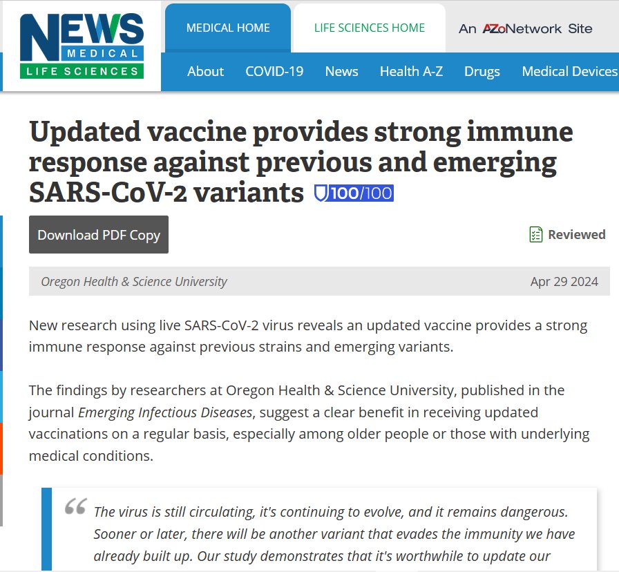 EN INGLÉS La vacuna actualizada proporciona una fuerte respuesta inmune contra variantes anteriores y emergentes del SARS-CoV-2 Posted on abril 30, 2024 por coronado https://www.news-medical.net/news/20240429/Updated-vaccine-provides-strong-immune-response-against-previous-and-emerging-SARS-CoV-2-variants.aspx