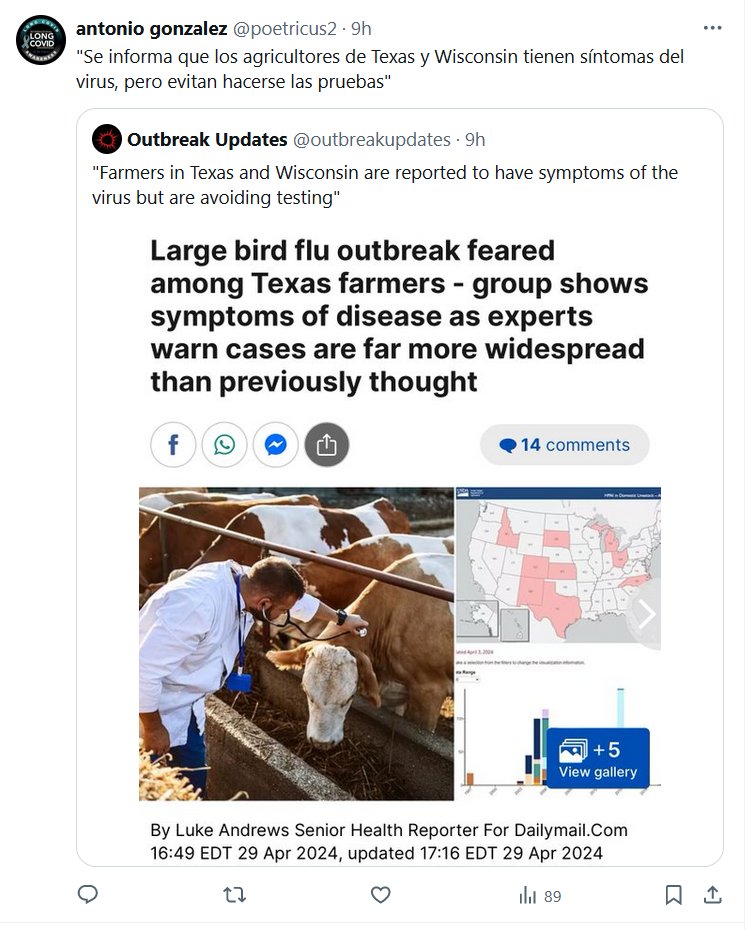 MÁS PLAGAS BÍBLICAS: GRIPE AVIAR EN MAMÍFEROS «Se informa que los agricultores de Texas y Wisconsin tienen síntomas del virus, pero evitan hacerse las pruebas» Posted on abril 30, 2024 por coronado