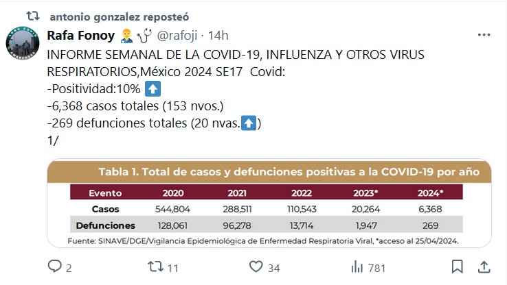 YA NO HAY MÁS? INFORME SEMANAL DE LA COVID-19, INFLUENZA Y OTROS VIRUS RESPIRATORIOS,México 2024 SE17 Covid: -Positividad:10% ⬆️ -6,368 casos totales (153 nvos.) -269 defunciones totales (20 nvas.⬆️)