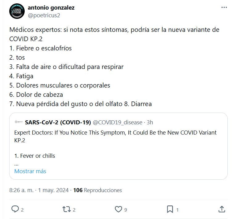 Médicos expertos: si nota estos síntomas, podría ser la nueva variante de COVID KP.2 1. Fiebre o escalofríos 2. tos 3. Falta de aire o dificultad para respirar 4. Fatiga 5. Dolores musculares o corporales 6. Dolor de cabeza 7. Nueva pérdida del gusto o del olfato 8. Diarrea