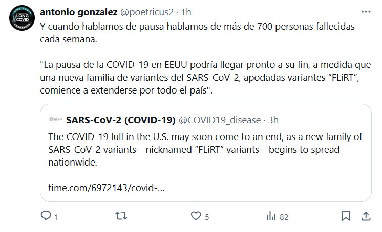Y cuando hablamos de pausa hablamos de más de 700 personas fallecidas cada semana. «La pausa de la COVID-19 en EEUU podría llegar pronto a su fin, a medida que una nueva familia de variantes del SARS-CoV-2, apodadas variantes “FLiRT”, comience a extenderse por todo el país»