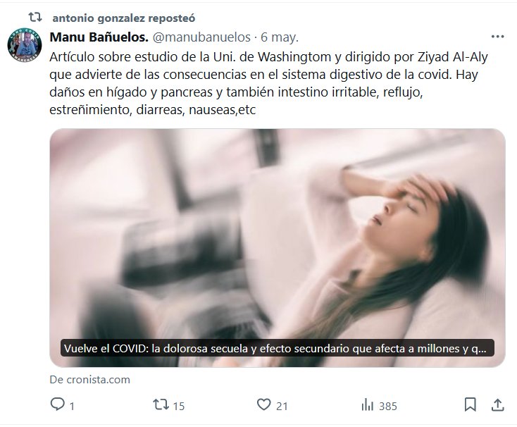 Artículo sobre estudio de la Uni. de Washingtom y dirigido por Ziyad Al-Aly que advierte de las consecuencias en el sistema digestivo de la covid. Hay daños en hígado y pancreas y también intestino irritable, reflujo, estreñimiento, diarreas, nauseas,etc