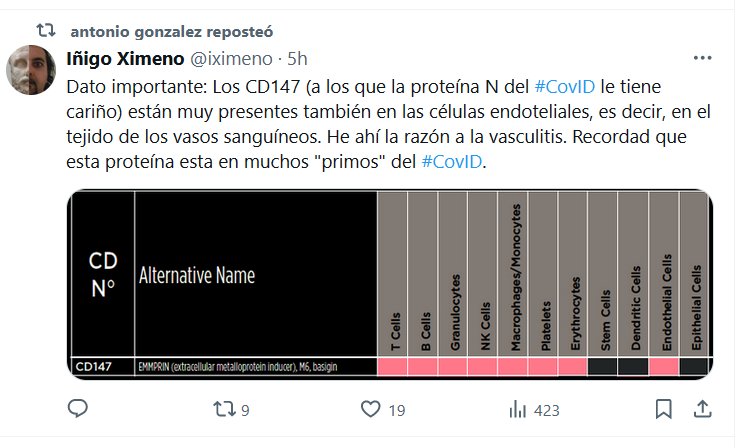 Dato importante: Los CD147 (a los que la proteína N del #CovID le tiene cariño) están muy presentes también en las células endoteliales, es decir, en el tejido de los vasos sanguíneos. He ahí la razón a la vasculitis. Recordad que esta proteína esta en muchos «primos» del #CovID