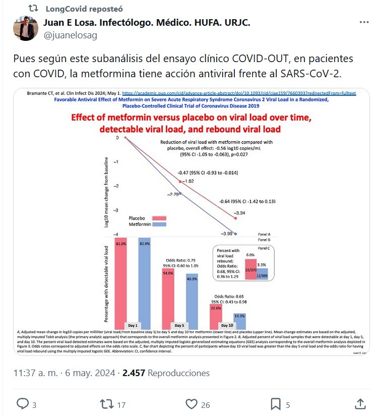 LongCovid reposteó: Juan E Losa. Infectólogo. Médico. HUFA. URJC. @juanelosag Pues según este subanálisis del ensayo clínico COVID-OUT, en pacientes con COVID, la metformina tiene acción antiviral frente al SARS-CoV-2