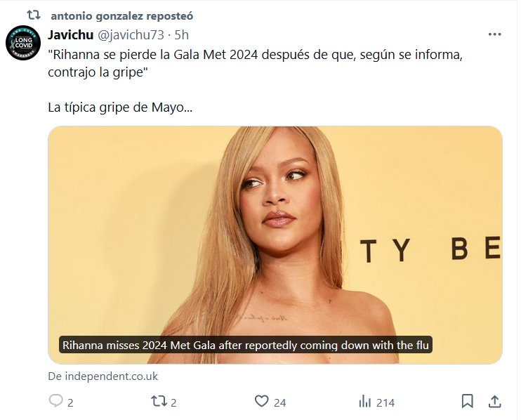 NODIGASCOVID HACE ESTRAGOS «Rihanna se pierde la Gala Met 2024 después de que, según se informa, contrajo la gripe» La típica gripe de Mayo… Posted on mayo 7, 2024 por coronado