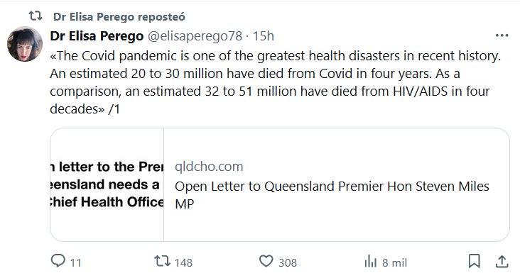 Y ESTO RECIÉN EMPIEZA (EN INGLÉS) Dra. Elisa Perego @elisaperego78 · «La pandemia de Covid es uno de los mayores desastres sanitarios de la historia reciente. Se estima que entre 20 y 30 millones han muerto a causa de Covid en cuatro años. En comparación, se estima que entre 32 y 51 millones han muerto a causa del VIH/SIDA en cuatro décadas»
