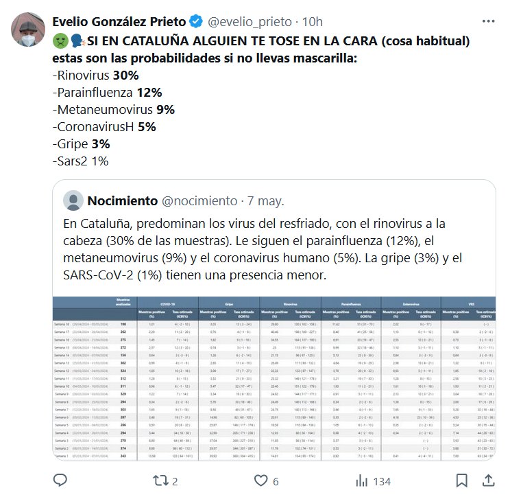 🤢🗣️SI EN CATALUÑA ALGUIEN TE TOSE EN LA CARA (cosa habitual) estas son las probabilidades si no llevas mascarilla: -Rinovirus 30% -Parainfluenza 12% -Metaneumovirus 9% -CoronavirusH 5% -Gripe 3% -Sars2 1%
