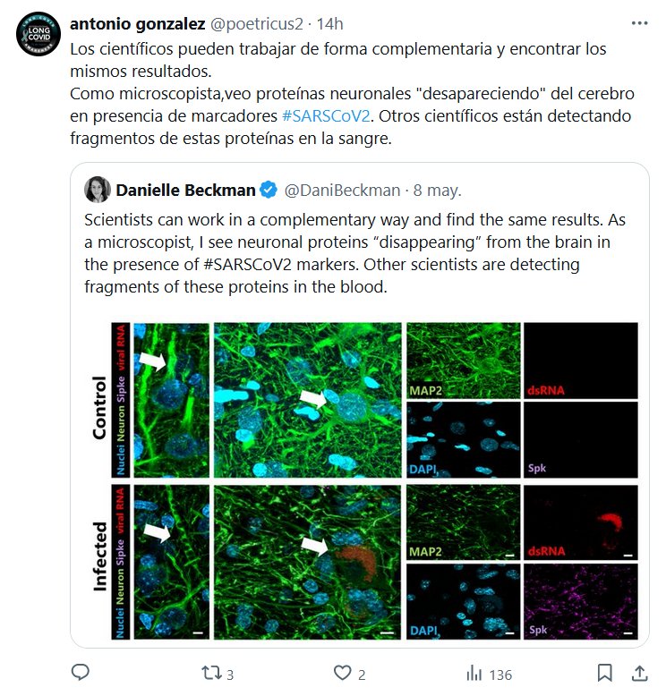 Los científicos pueden trabajar de forma complementaria y encontrar los mismos resultados. Como microscopista,veo proteínas neuronales «desapareciendo» del cerebro en presencia de marcadores #SARSCoV2. Otros científicos están detectando fragmentos de estas proteínas en la sangre