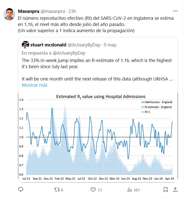 El número reproductivo efectivo (Rt) del SARS-CoV-2 en Inglaterra se estima en 1,16, el nivel más alto desde julio del año pasado. (Un valor superior a 1 indica aumento de la propagación) Posted on mayo 10, 2024 por coronado