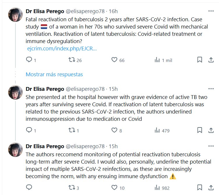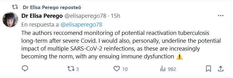 EN INGLÉS Dra. Elisa Perego @elisaperego78 Los autores recomiendan el seguimiento de la posible reactivación de la tuberculosis a largo plazo después de un Covid grave. Personalmente, también quisiera subrayar el impacto potencial de las reinfecciones múltiples por SARS-CoV-2, ya que se están convirtiendo cada vez más en la norma, con la consiguiente disfunción inmune ⚠️