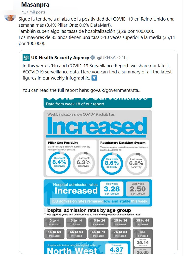 FIN DE PANDEMIA? Sigue la tendencia al alza de la positividad del COVID-19 en Reino Unido una semana más (8,4% Pillar One; 8,6% DataMart). También suben algo las tasas de hospitalización (3,28 por 100.000). Los mayores de 85 años tienen una tasa >10 veces superior a la media (35,14 por 100.000)