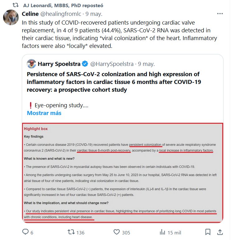 NO ERA LEVE (EN INGLÉS) En este estudio de pacientes recuperados de COVID sometidos a reemplazo de válvula cardíaca, en 4 de 9 pacientes (44,4%), se detectó ARN del SARS-CoV-2 en su tejido cardíaco, lo que indica *colonización viral* del corazón. Los factores inflamatorios también fueron elevados *localmente*