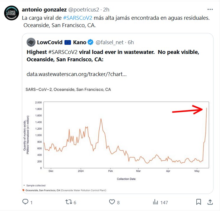 13 DE MAYO DE 2024 La carga viral de #SARSCoV2 más alta jamás encontrada en aguas residuales. Oceanside, San Francisco, CA Posted on mayo 13, 2024 por coronado