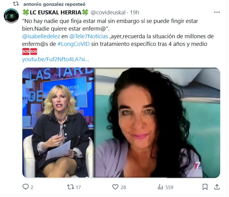 🍀LC EUSKAL HERRIA🍀 @covideuskal · 19h «No hay nadie que finja estar mal sin embargo sí se puede fingir estar bien.Nadie quiere estar enferm@». @isabelledelez en @Tele7Noticias ,ayer,recuerda la situación de millones de enferm@s de #LongCoVID sin tratamiento específico tras 4 años y medio 🆘🆘