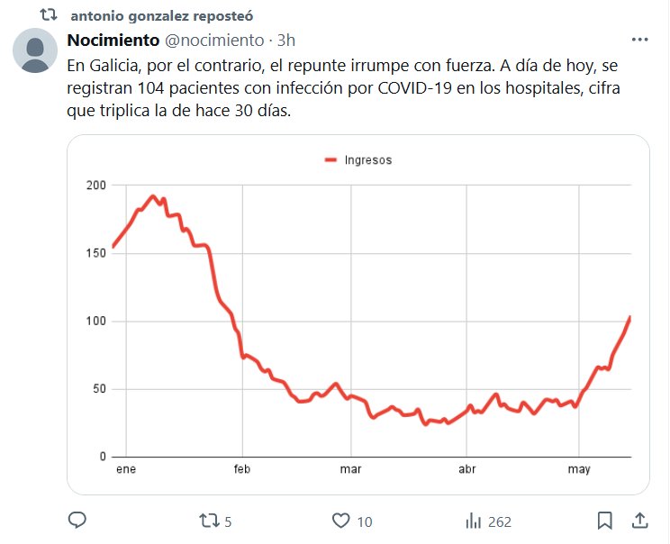 En Galicia, por el contrario, el repunte irrumpe con fuerza. A día de hoy, se registran 104 pacientes con infección por COVID-19 en los hospitales, cifra que triplica la de hace 30 días. Posted on mayo 15, 2024 por coronado